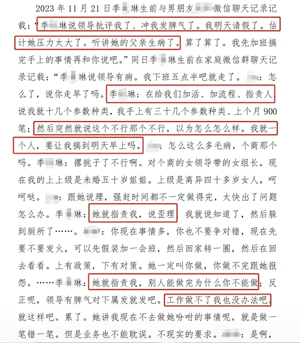 合肥市包河区法院今年1月22日作出的一审判决书显示,警方的《报警记录》载明,小琳近期因工作压力过大、筹备婚礼等原因,导致情绪不好,无法正常睡眠,2023年11月22日到滨湖医院就诊,23日下午从自己房间窗户跳楼坠亡。小琳生前工作区域的监控视频记载,被告陈某某于当月20日、21日、22日在工作时间多次与小琳进行长时间谈话交流。原告提交的小琳与男友及在家庭群内发布的聊天记录中,小琳多次提到提出请假后,被领导派了大量工作并遭到指责。比如小琳在家庭群内说,“我坚持不了了,被讲的拉肚子”“我去开个病假条吧”“是不是想把我逼走”。